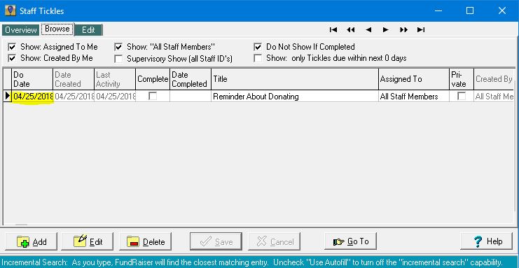 When you create a “tickle” or reminder in Fundraiser Software, it will show up on the Task List when the program opens if it is due, or overdue. However, with the release of 5.20, we have an even more visible way of being reminded. Now, when a tickle is due, a reminder will show in the upper right-hand corner of the program until the reminder is marked completed.