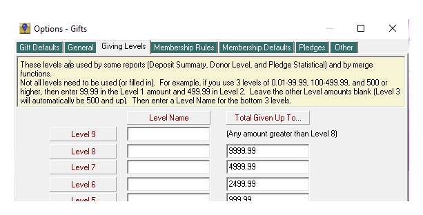 When you go to OPTIONS > GIFTS on the “Giving Levels” tab you can see the specific levels for your organization. These will then be shown on the Giving Levels Report, found under Reports > Giving Level Report. Giving Levels and the Giving Level Report are available in FundRaiser Select and Professional.