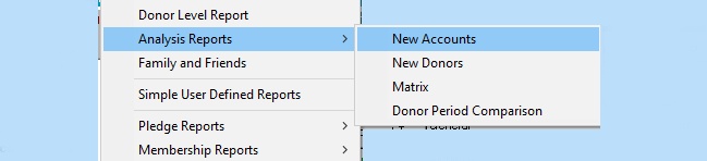 If your goal is to increase your total numbers of prospects (and/or donors), then you may wish to know how many accounts (or names in your database) that your organization has.  The New Accounts report will show you the number of new accounts by month for your organization. This allows you to track trends, as well as perhaps set goals to increase the number of new accounts each month.